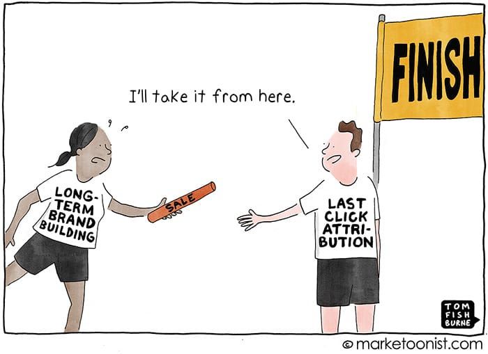 Wij kennen in Nederland het gezegde ‘De laatste loodjes wegen het zwaarst’. Afgaand op de cartoon van Tom Fishburne kunnen we dat niet zeggen. De estafette is gelopen en performance marketing zet de laatste meter. Ik vergelijk het soms met de spits van een voetbalteam. Die scoort vaak en wordt bejubeld door het publiek. Maar ook die spits is afhankelijk van de aanvoer. Van de assist die hij krijgt. In marketing komt die assist van andere kanalen die vaak een lange termijn effect hebben. Dat mag niet uit het oog worden verloren. Krijg je een te nadrukkelijke focus op de ‘last click’ dan loop je bovendien het risico op de zogenaamde ‘Doom loop’ zoals afgelopen voorjaar nog door WARC gepubliceerd in haar rapport ‘The Multiplier effect.